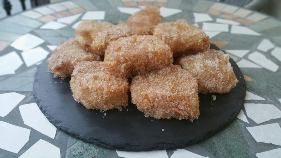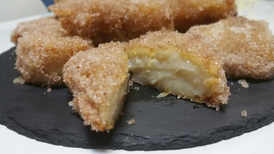 Ponemos la sartén con aceite para freír, pasamos cada porción por la mezcla de Yolanda, y freímos hasta que los dos lados estén dorados, ponemos sobre un plato con papel absorbente y pasamos por el azúcar y la canela para rebozar.