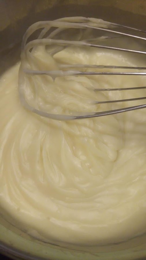 Ahora mezclamos la bebida vegetal que habíamos apartado en un vaso con la maicena, yo he usado un bote de cristal con tapadera de los que reciclo para mezclar bien, hasta que no queden grumos, una vez tengamos la mezcla hecha, colamos la bebida vegetal del cazo para quitar la cáscara de limón y la canela y mezclamos con la mezcla de la maicena, volvemos a poner en el fuego, y movemos hasta que espese quedara una textura como la de la foto.