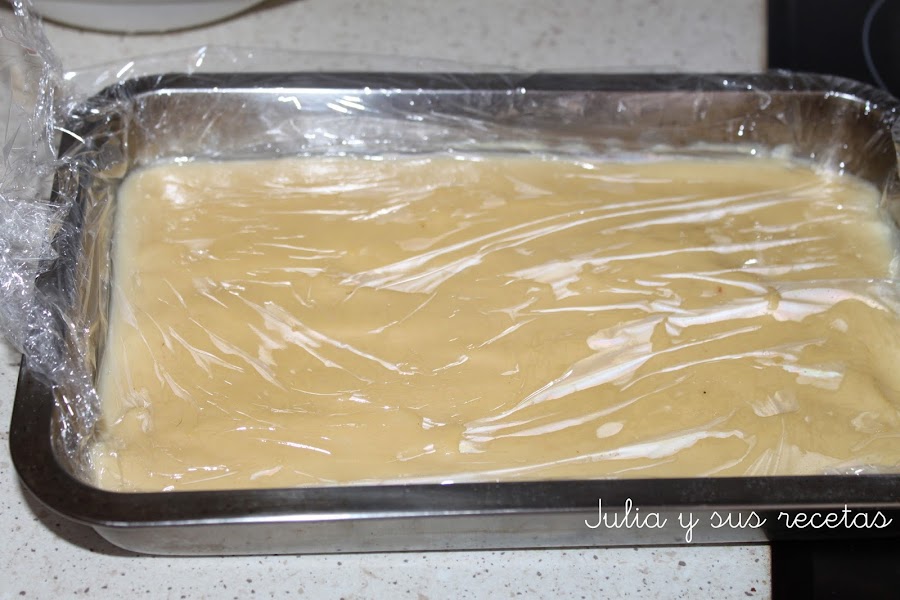 La volcamos sobre un recipiente cuadrado o rectangular , lo tapamos con film transparente y dejamos que se enfríe completamente, 4-5 horas. Yo la meto una vez fría en el frigorífico.