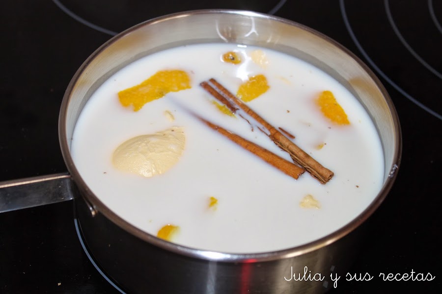 El resto de la leche la ponemos a hervir con la piel de limón, la mantequilla y el palo de canela durante 5 minutos y la dejamos reposar y enfriar.