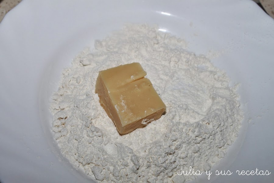 Una vez fría cortamos cuadraditos de la masa , la pasamos por harina.