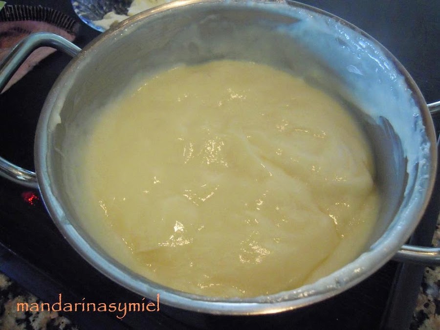 Pon con cuidado y removiendo continuamente la mezcla de yemas a la leche hervida. No dejes de remover en ningún momento porque se pega enseguida. Deja cocer unos minutos, retira del fuego.