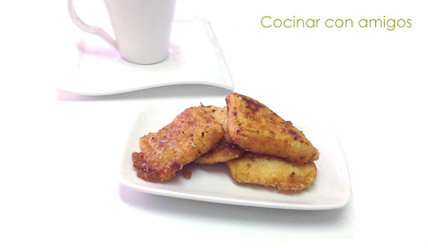 Enfriamos en la nevera aproximadamente 30 minutos y cortamos en porciones. Pasamos por la harina y luego por huevo, freímos en abundante aceite caliente y escurrimos en un plato con papel de cocina.