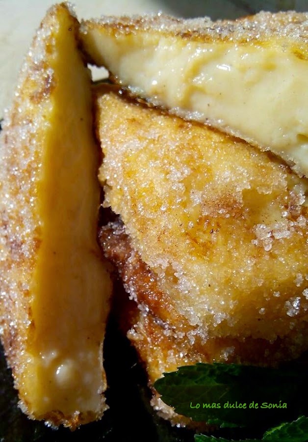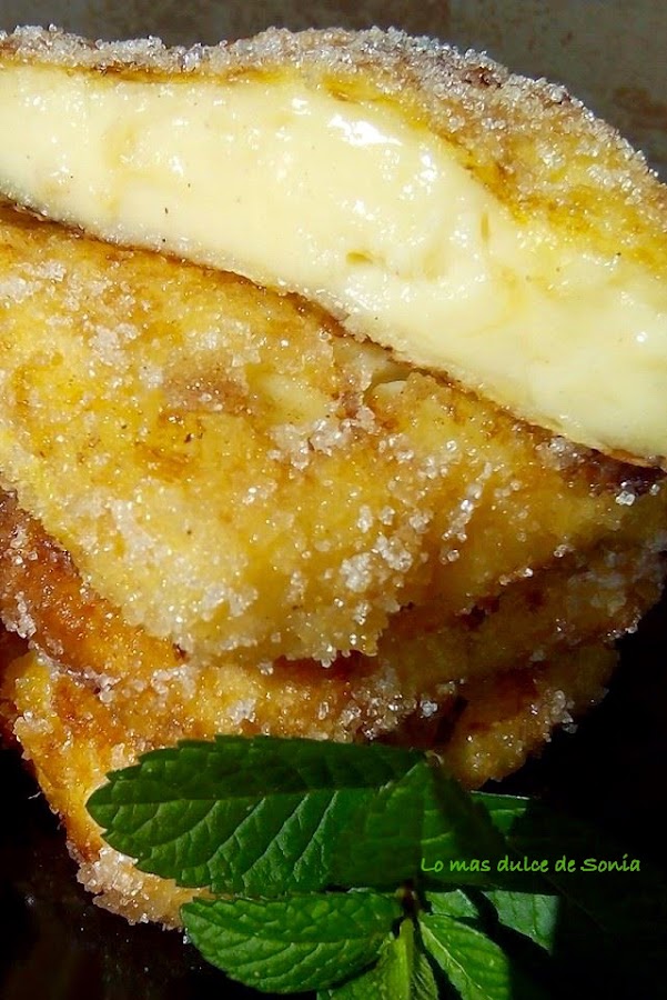Una vez fría, cortamos en porciones, pasamos por harina y huevo y las freímos en abundante aceite caliente. Las rebozaremos con azúcar y canela.