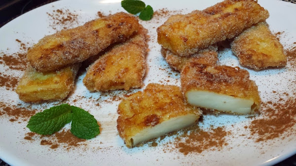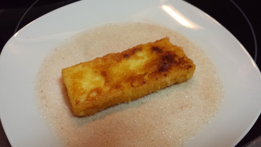 Preparamos una mezcla con el azúcar y la canela en polvo y vamos pasando por ella las porciones de leche frita.