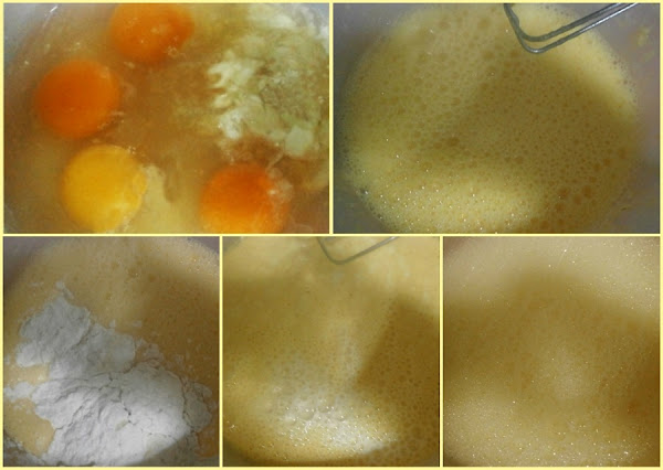 En un bol batimos los huevos y el azúcar con una batidora de varillas, hasta que doblen el tamaño. Después añadimos la harina, y seguimos batiendo. Por último, añadimos la leche, y batimos hasta que todo esté bien integrado.