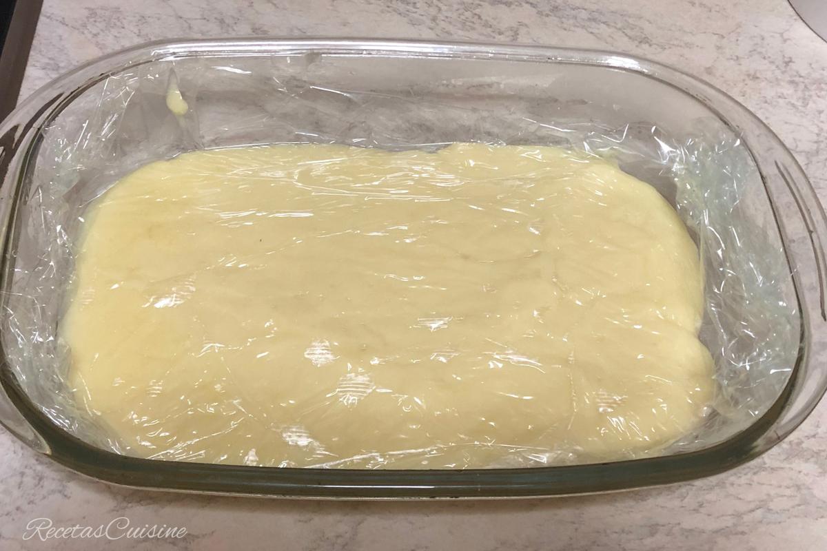 4. Pasamos a una fuente recetangular donde el alto de la masa no exceda de 2cm. Cubrimos con papel film, que quede totalmente en contacto con la masa, para que no se forme costra. Dejamos templar un poco a temperatura ambiente, y pasamos a la nevera, donde mantendremos durante un par de horas para que la masa se enfríe por completo y tome la consistencia adecuada para poder cortarla en porciones.