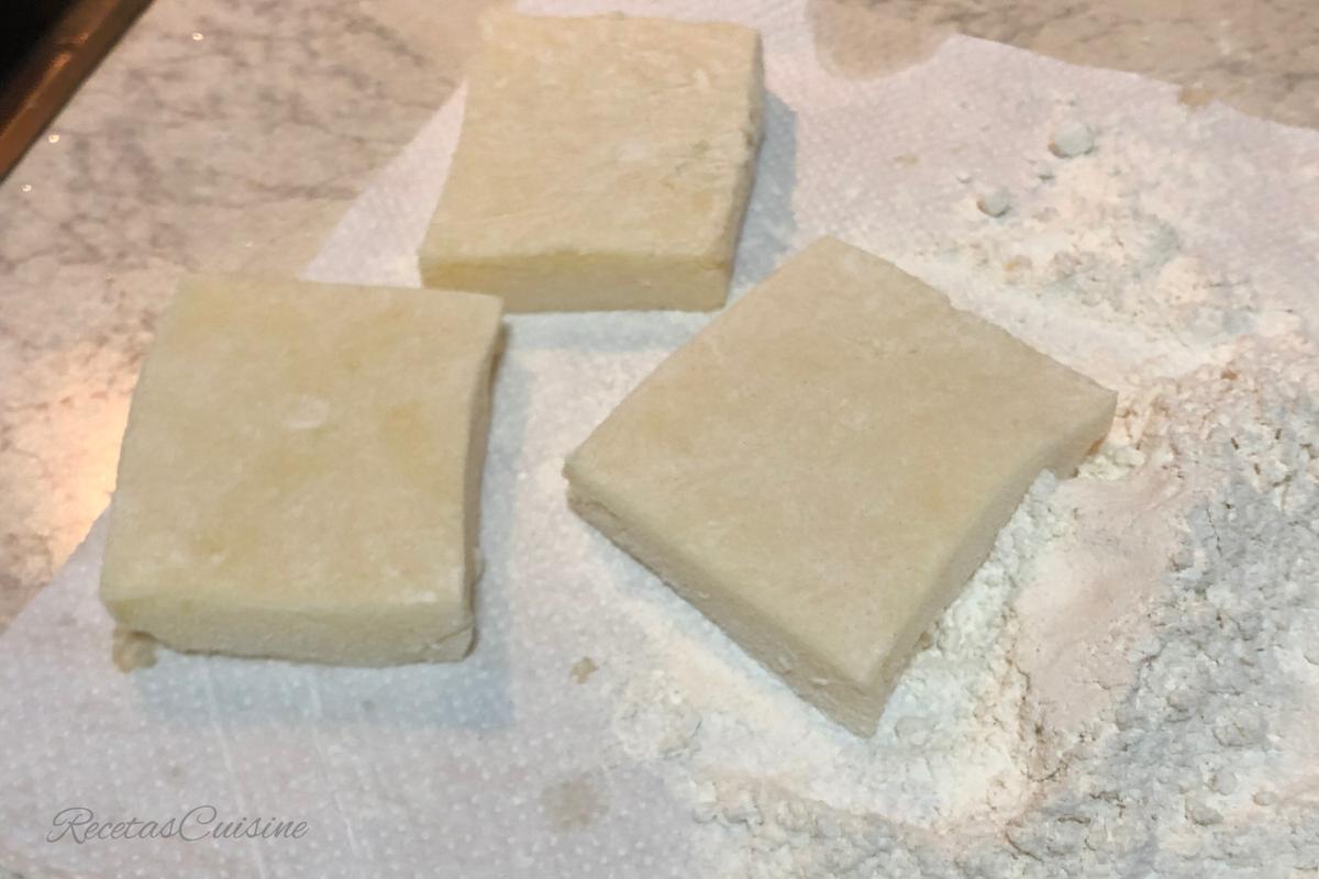 6. Batimos el huevo, rebozamos los cuadrados primero en harina, sacudimos bien el exceso de harina y los pasamos por el huevo batido. Escurrimos bien del huevo y freímos en aceite muy caliente.
