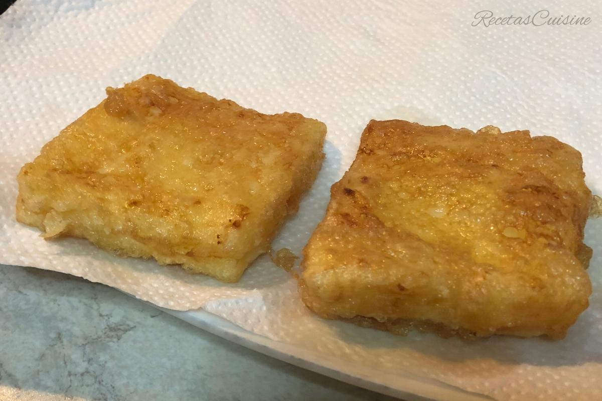 7. Una vez fritos, los dejamos sobre papel de cocina, para que suelten el exceso de grasa de la fritura.