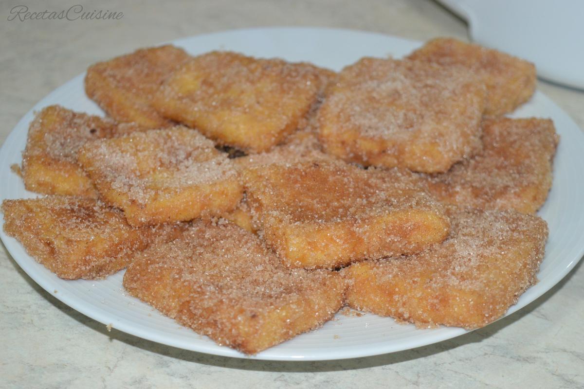 8. Aún calientes las porciones, las rebozamos de manera abundante en una mezcla que habremos preparado con azúcar y canela y vamos colocando en el palto o fuente donde lo vayamos a servir.