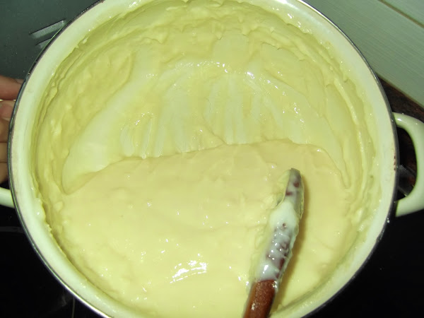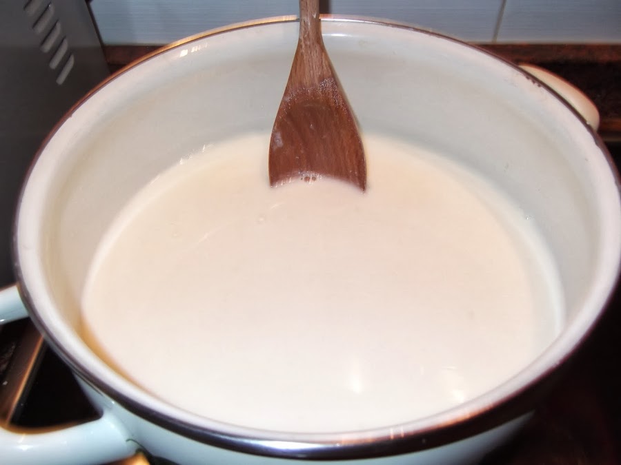 Ahora con una cuchara de madera vamos removiendo la mezcla a fuego bajo hasta que espese. No dejar de dar vueltas, ya que si no se puede pegar en el fondo, suele tardar sobre una hora, así que no os desesperéis si al principio está muy líquida y tardará un rato en espesar. Para saber cuando la leche frita está lista vuelca la olla hacia un lado y empuja toda la leche hacia ese mismo lado. Luego coloca la olla en horizontal y fíjate si se desplaza la leche. Si no se mueve o se mueve muy lentamente es que la leche está lista, si lo hace rápido es que tiene que estar más tiempo en el fuego.