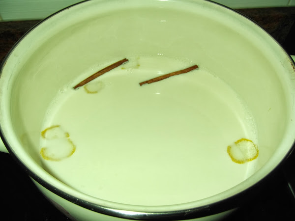Pones 750 mililitros de leche en la olla con la canela en rama y la cáscara de limón. Pones a fuego medio y dejas hasta que este a punto de hervir, Apartas la olla del fuego y la tapas para que la leche infusione con la canela y el limón durante 30 minutos.