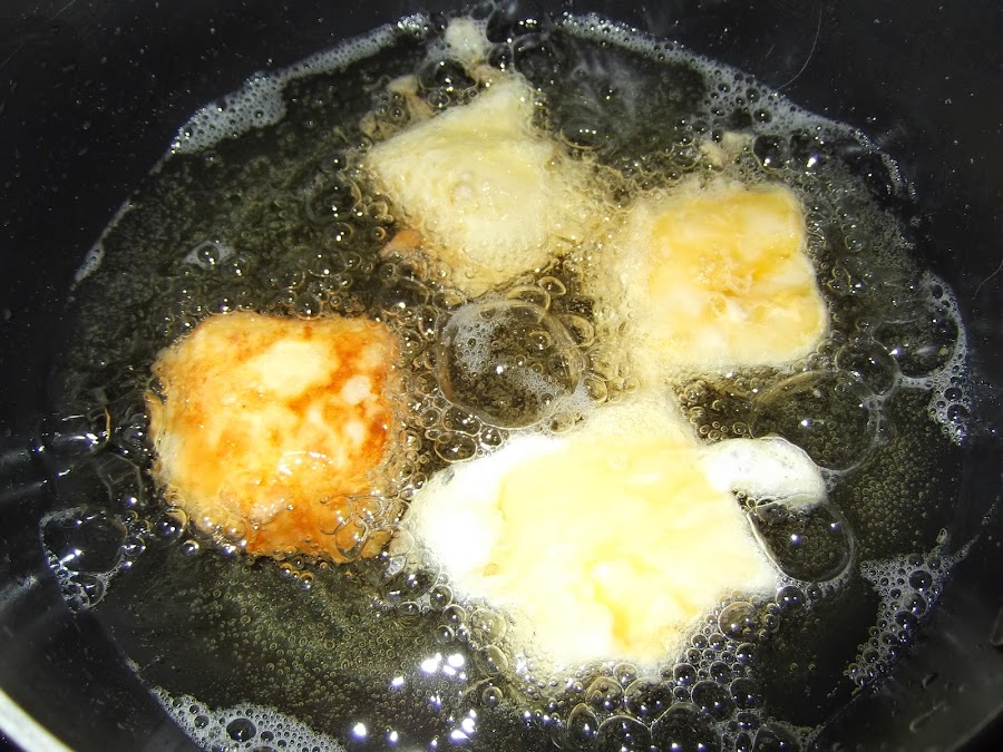 Una vez pasado este tiempo, saca la leche del frigorífico y córtala en porciones. Pásala primero por maicena y luego por huevo batido. Después fríe los trozos de leche frita en aceite bien caliente durante un minuto por cada lado, tiene que quedar dorada.