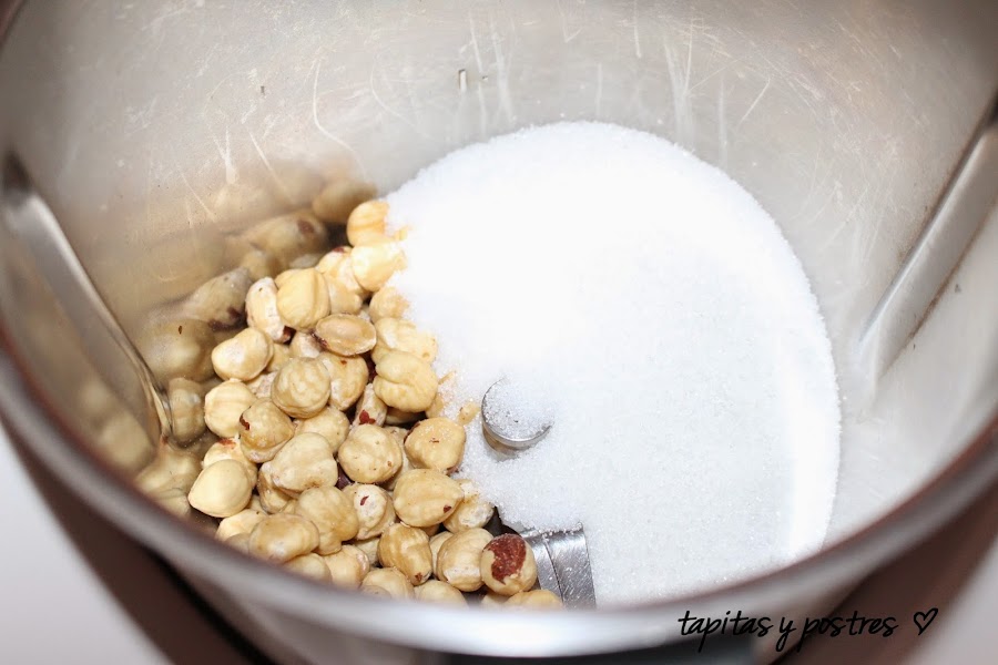 Primero trituramos las avellanas con el azúcar. Aunque la receta original pide 150 gr, yo echo el paquete entero de avellanas, unos 200 gr.