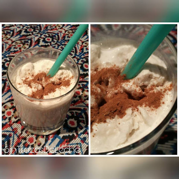 Con unas varillas eléctricas montamos la nata (crema de leche) vegetal con el azúcar glass. Una vez que la bebida vegetal de la nevera esté fría la colamos y la incorporamos a la nata (crema de leche) vegetal montada, removemos con cuidado hasta que esté todo bien mezclado.
