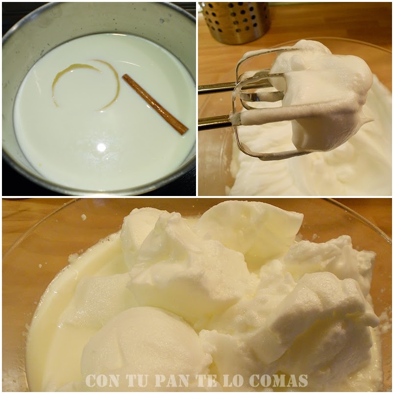 2. Colamos la leche y montamos las claras a punto de nieve con una cucharada de azúcar. Mezclamos suavemente hasta que quede totalmente integrada con la leche fría. Si la quieres más espesa utilizas tres claras y si la quieres más líquida con dos es suficiente.