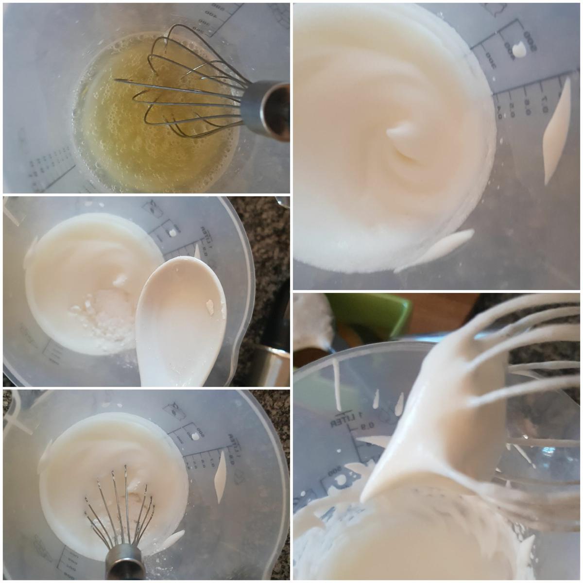 El merengue Cuando tengamos la leche bien fresquita, montamos nuestro merengue. Cogemos las dos claras y empezamos a batir con las varillas eléctricas hasta que empiecen a crear espuma, en este punto le añadimos el azúcar glass, y no paramos de batir hasta dejarlas bien montadas.