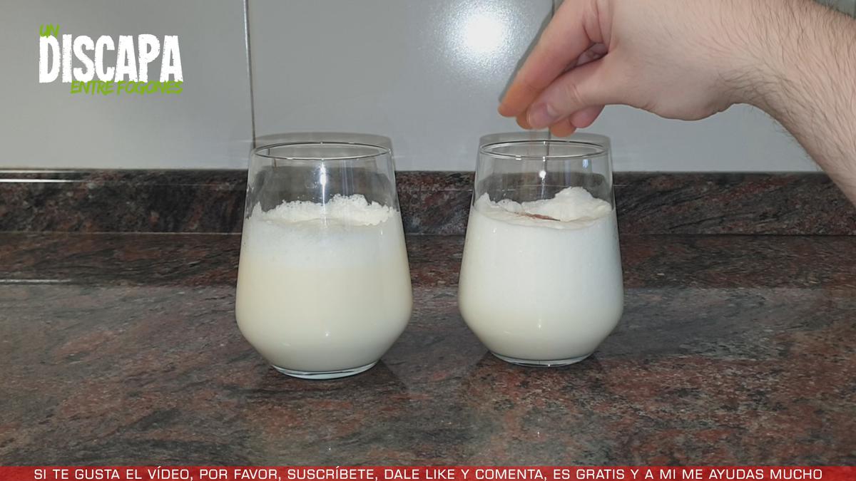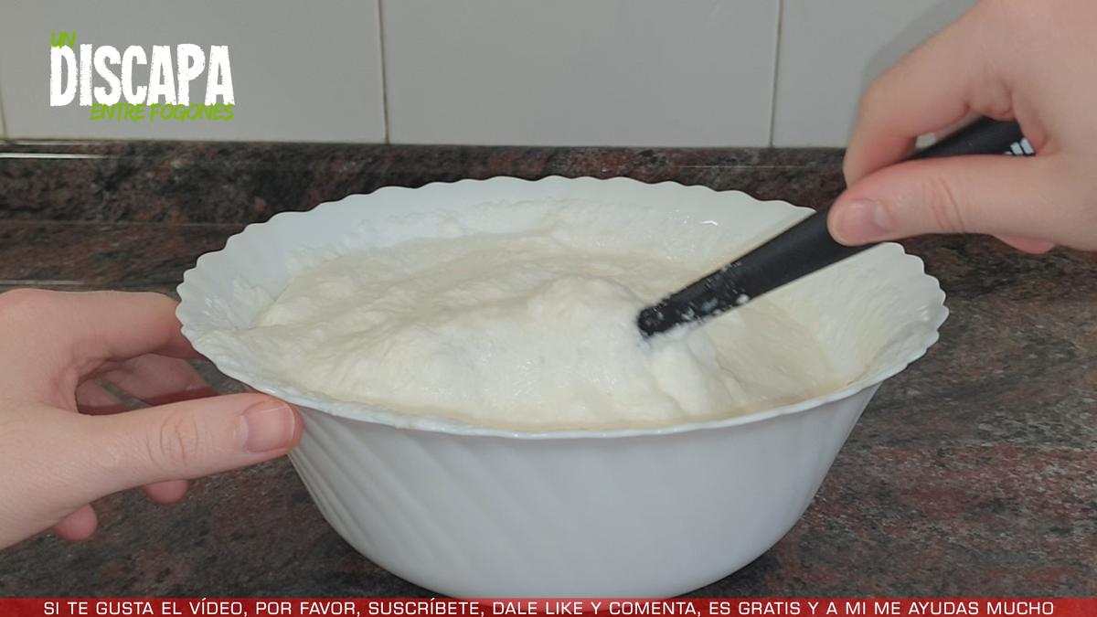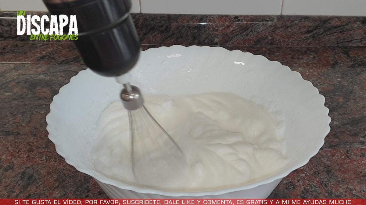 4Así que ahora tenemos 2 recipientes, uno con la leche y otro con las claras montadas. Lo que vamos a hacer es ir añadiendo la leche poco a poco al recipiente con las claras y vamos a ir mezclando con movimientos envolventes.