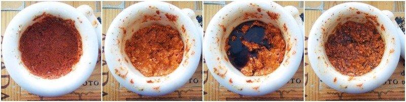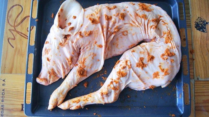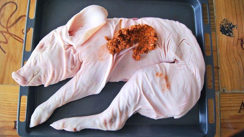 4. Una vez tenemos la pasta de aderezo lista, vamos a untar bien y por todas partes de nuestro cochinillo, pero solo vamos a usar 3 partes de la pasta, reservando una parte para luego.