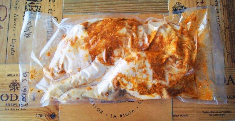 5. Metemos el cerdito en la bolsa de vacío y le añadimos el aderezo que habíamos reservado junto con las hojas de laurel, sellamos la bolsa y dejamos macerar en frío entre 6 a 12 horas antes de cocinar para que se mezclen e impregnen bien todos los sabores.