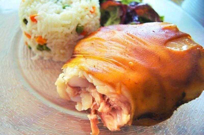 9. Horneamos en horno pre calentado a 220ºC (428ºF) en modo grill o si tienes la opción, modo grill con aire, esto durante unos 30 minutos o hasta que la piel quede dorada.