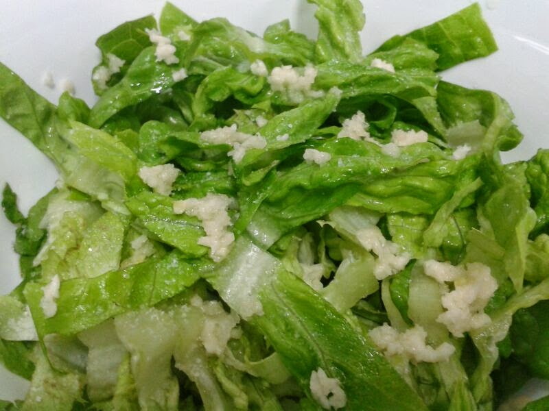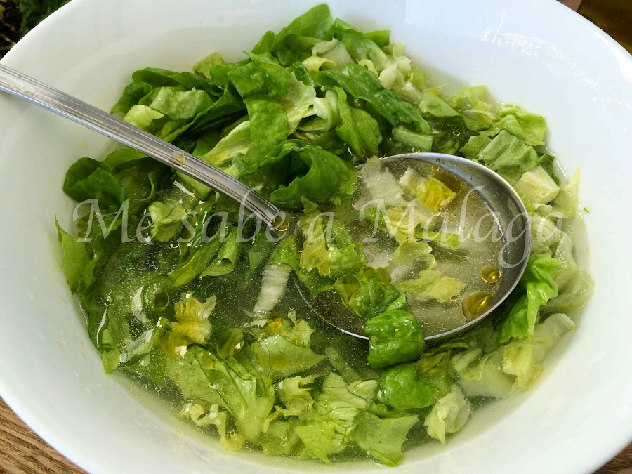 Añadimos el zumo de limón o el vinagre y el aceite de oliva. Mezclamos bien y agregamos agua hasta cubrir bien toda la lechuga.