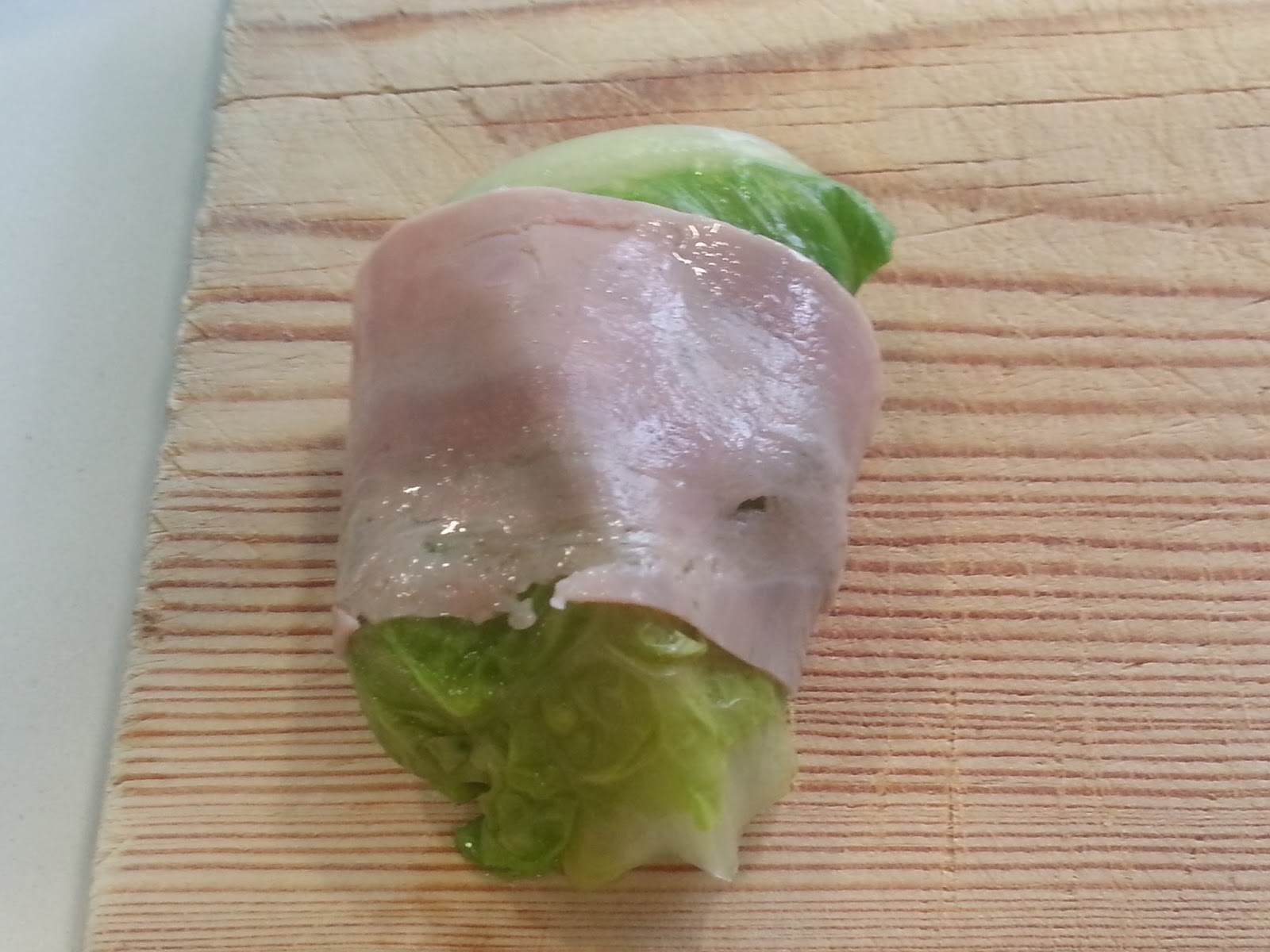 6. - Extendemos media loncha de jamón, y ponemos un paquete de lechuga o un cogollo y enrollamos.