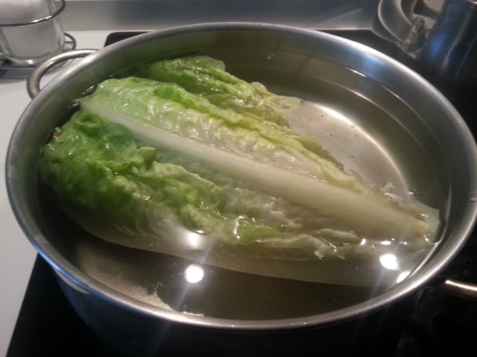 1. - Primero pondremos una cacerola grande con abundante agua con sal. Cuando el agua rompa a hervir metemos las lechugas y las cocemos durante unos 10 minutos. Las sacamos y reservamos el agua. Yo he tenido que cocerlas de una en una porque eran enormes.