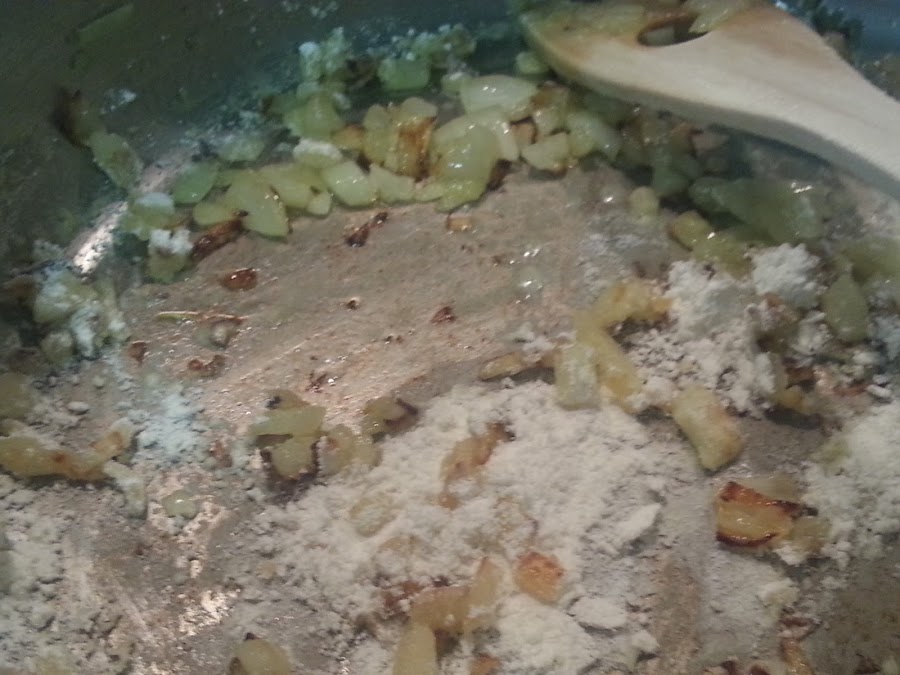 5. - Cuando la cebolla empiece a dorarse, le añadimos la cucharada de harina, removemos para que se tueste un poco .