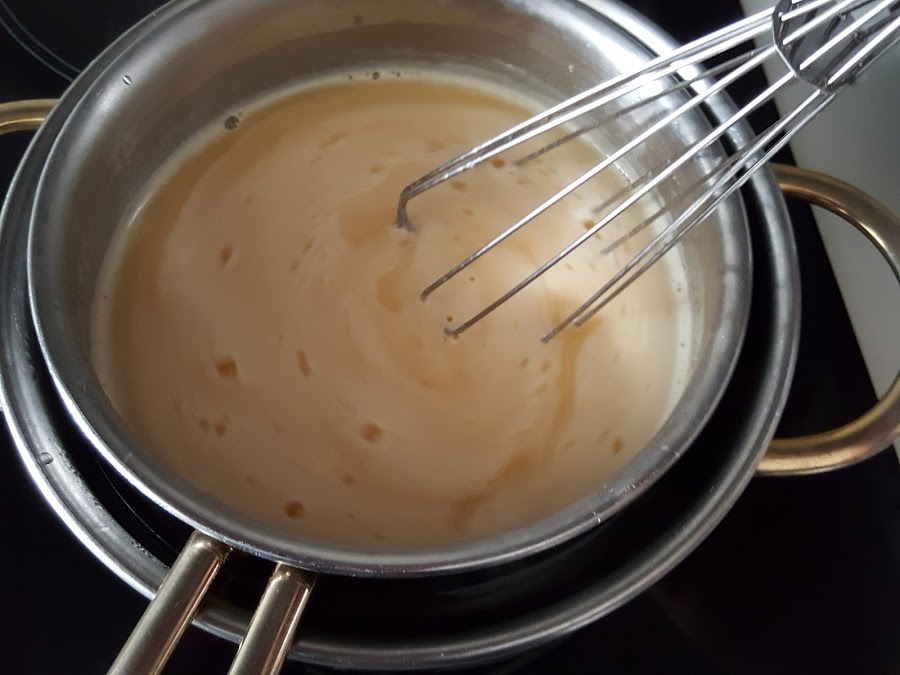3. - Lo mezclamos bien con un batidor y ponemos el cazo dentro del otro que teníamos con agua hirviendo, para hacer la crema al baño maría.