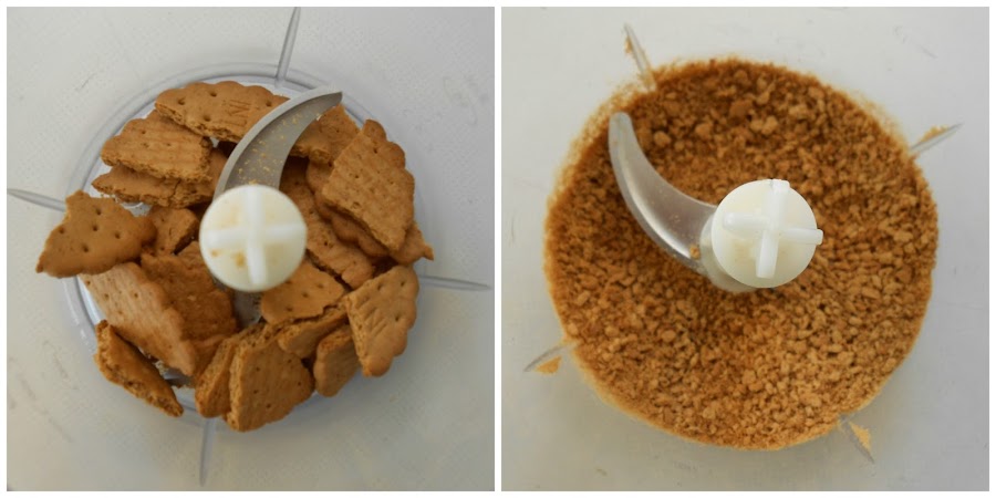 Trituramos las galletas en el robot de cocina o las colocamos dentro de una bolsa plástica y pasamos un rodillo por encima aplastando bien.