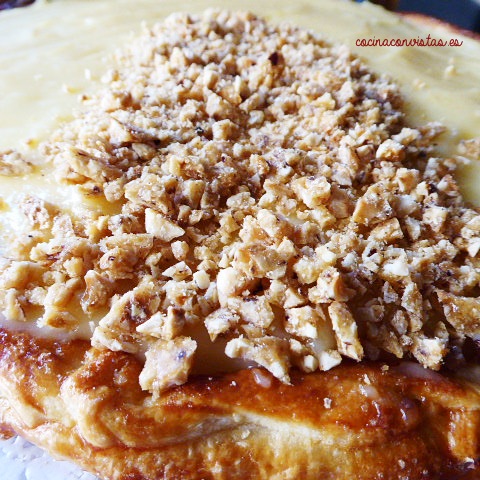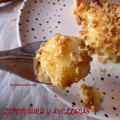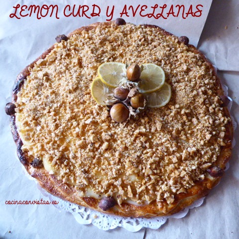 extendemos lo más posible las avellanas. Una vez se hayan caramelizado y endurecido las avellanas, formando un guirlache duro las picamos de nuevo. Reservamos.Sobre la base de hojaldre extendemos una capa de lemon curd ya frío