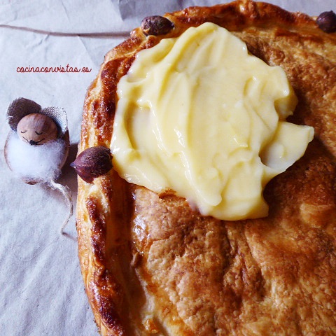 Extendemos la masa de hojaldre sobre el papel de hornear y recortamos el borde de 1,5 a 2 cm de ancho, reservamos el recorte.