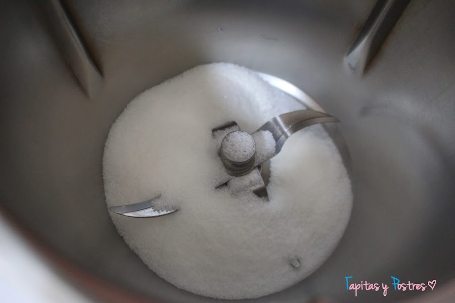Vamos a poner el azúcar en el vaso de la thermomix y pulverizamos 20 segundos a velocidad progresiva 5-10