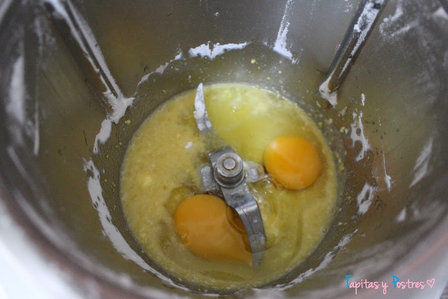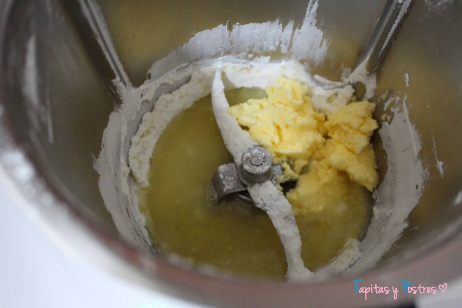 Agregaremos la mantequilla a temperatura ambiente y el zumo de los dos limones colado. Batimos un minuto a velocidad 2.