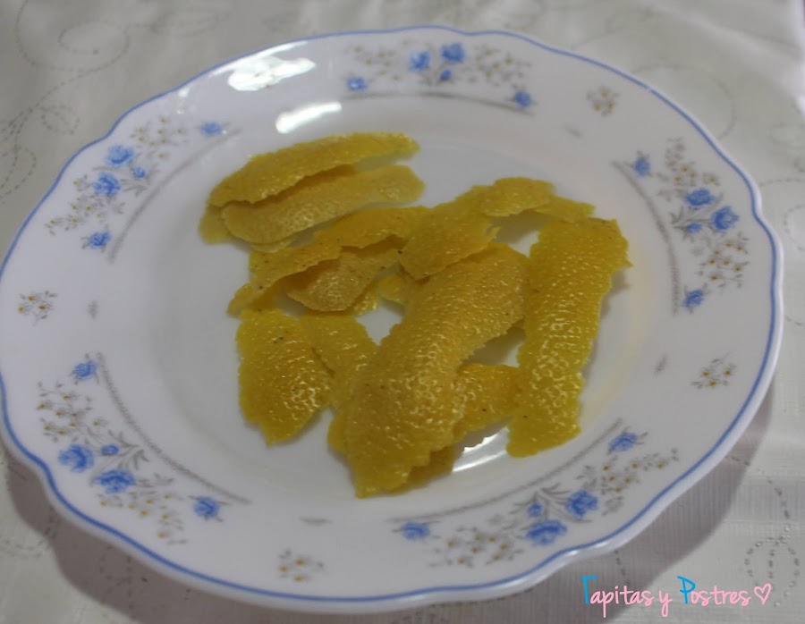 Sacamos la piel de los dos limones, evitando la parte blanca. La ponemos en un plato y la secamos un minuto en el microondas.