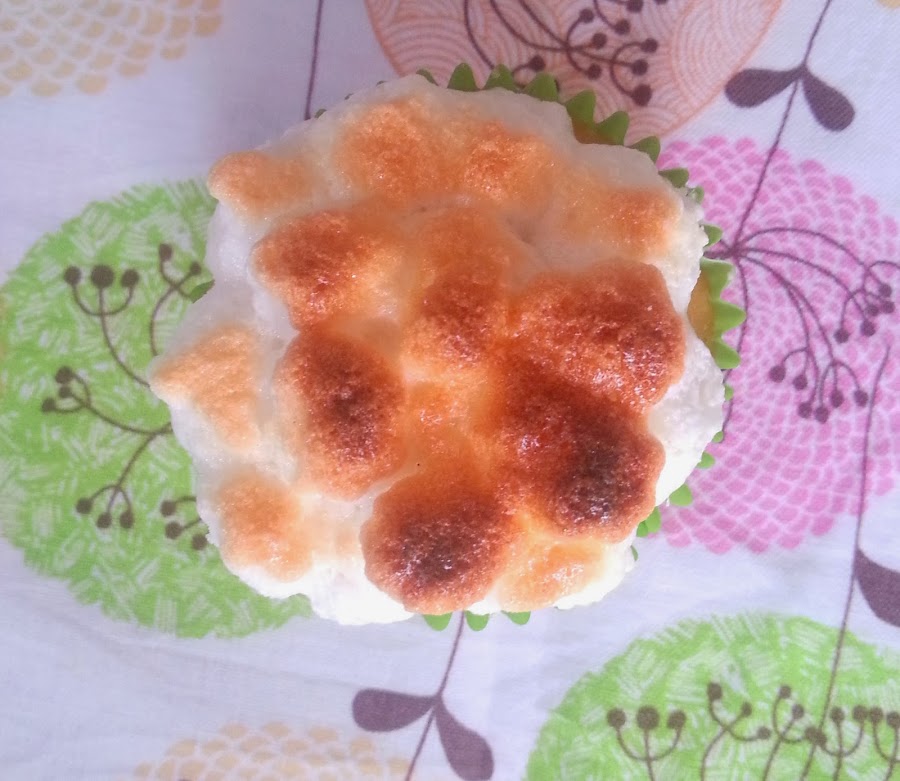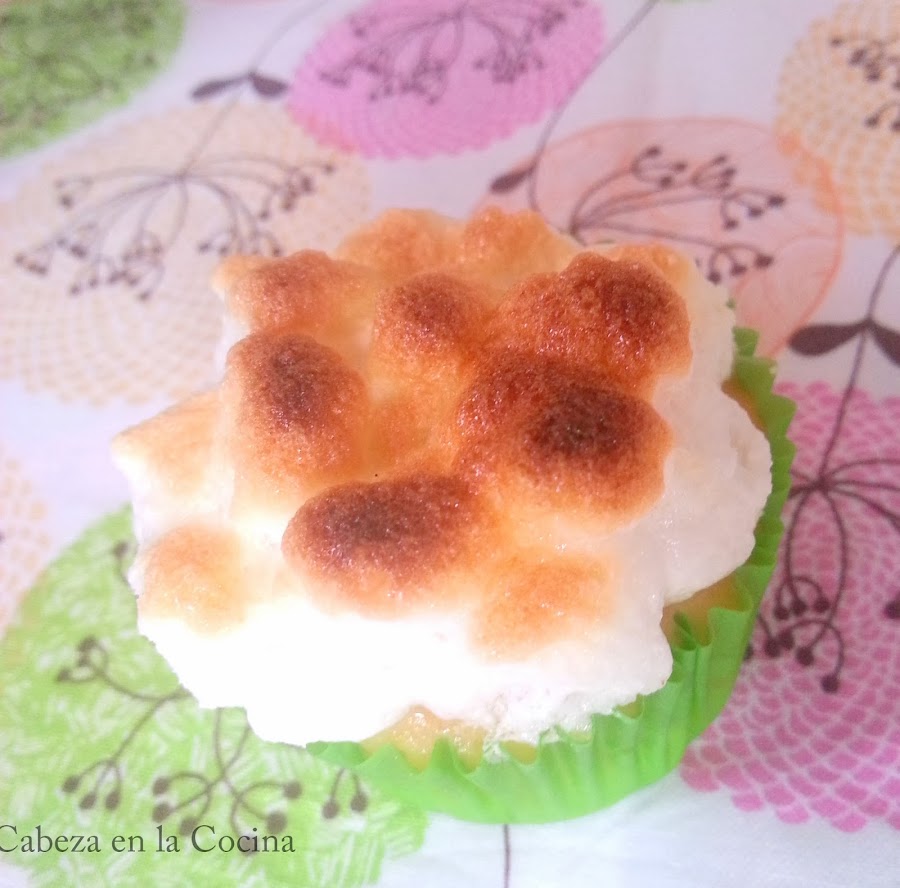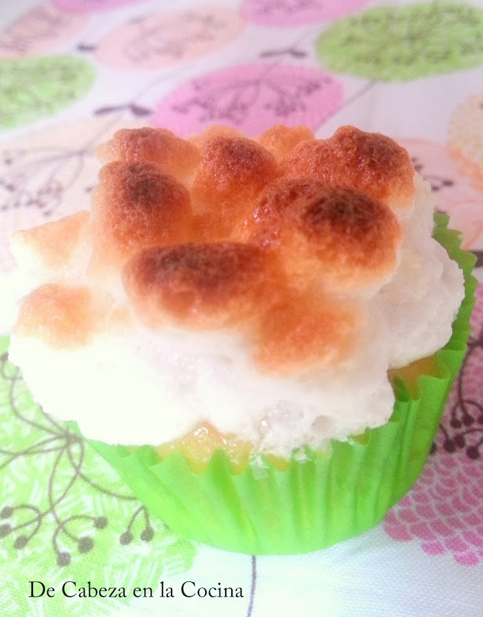 Ponemos el merengue en una manga pastelera con una boquilla Nº 12 wilton y cubrimos haciendo puntos con la manga pastelera totalmente en vertical al cupcake hasta cubrir toda la superficie del cupcake, encendemos el horno en dorador, metemos los cupcakes por uno o dos minutos sin retirarnos del horno para que no se quemen.