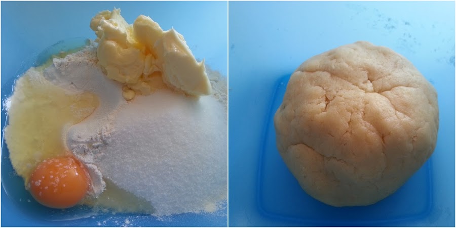 1. - Encendemos el horno a 180º . Echamos en un bol todos los ingredientes de la pasta quebrada y amasamos hasta conseguir una masa granulosa pero homogénea.
