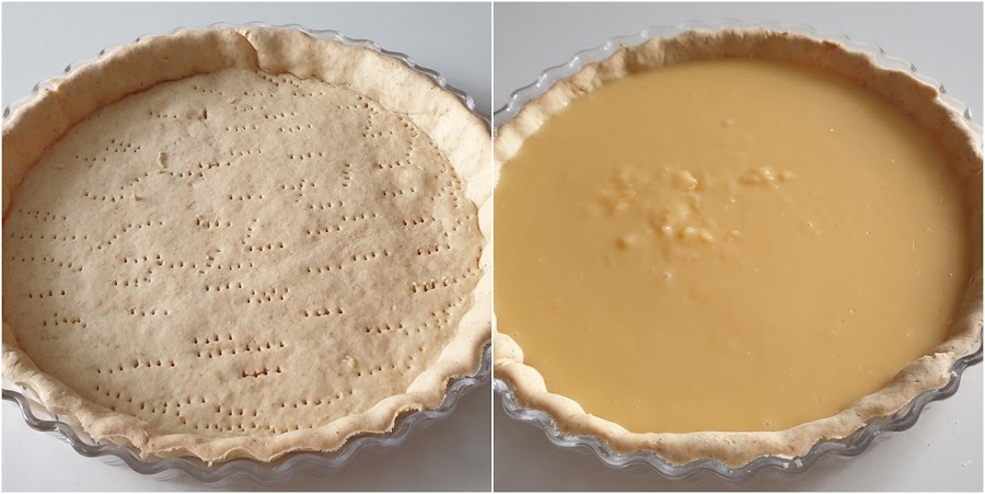 6. - Sacamos la masa ya horneada y echamos la crema de limón, que cubra toda la superficie. En este punto, si la tarta es para hoy , os ponéis con el merengue, en caso contrario, yo prefiero hacerlo al día siguiente, que es lo que he hecho en esta ocasión.