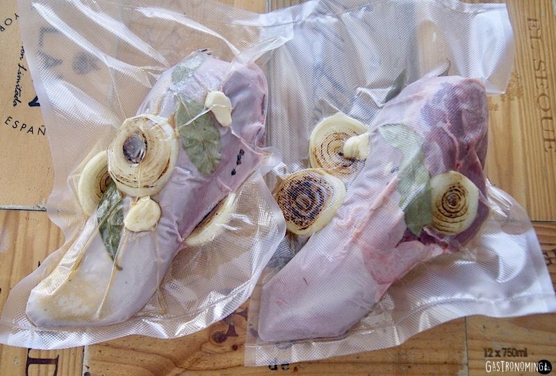 En la bolsa de vacío, como ya te comentamos, puede poner las hierbas o especias que más te gusten, ahí tienes el tomillo, romero (no te pases que la lías), el orégano fresco es una buena opción, salvia… En vez de la cebolla “planchada” puedes hacer lo mismo con unos bulbos de hinojo, Oooh! espectacular, y en cuanto a las especias, granos de pimienta de otro color, unas semillas de hinojo, cilantro o cominos y verás que con poca maña puedes cambiar el plato por completo.Otro truco bien empleado para esta receta es, triturar bien las cebollas que metimos en la bolsa y añadirlas a la salsa, no solo te aportarán sabor, sino también textura y espesor, no dejes de robarlo.