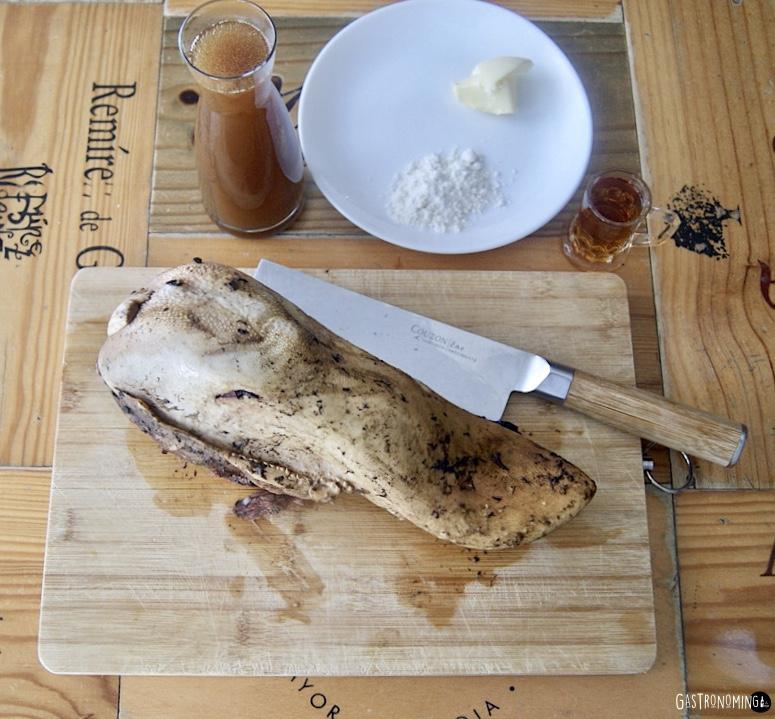 9. En una cazuela, colocamos una nuez de mantequilla a fuego medio y cuando se derrita añadimos la harina, vamos hacer un roux para hacer una salsa velouté con los jugos que nos dejó la lengua.10. Así que, una vez dorada la harina, añadiremos el brandy, seguidamente, poco a poco y moviendo constantemente iremos agregando los jugos de la lengua y dejamos reducir hasta conseguir una salsa con la consistencia deseada, debería ser algo más ligera que una velouté tradicional. Rectificamos la sal.