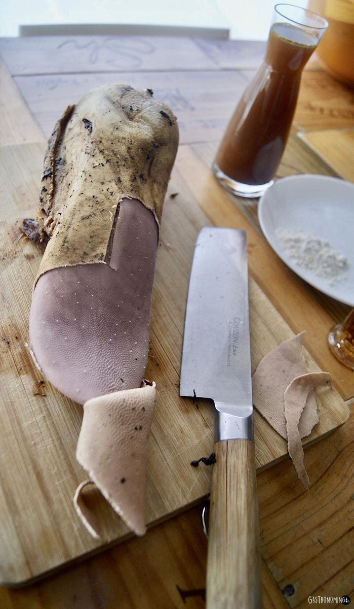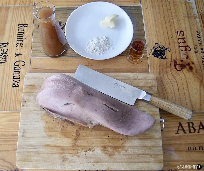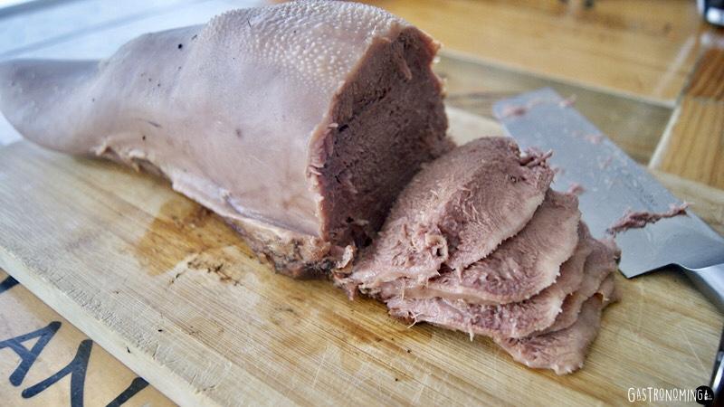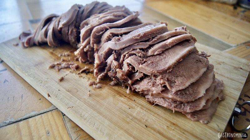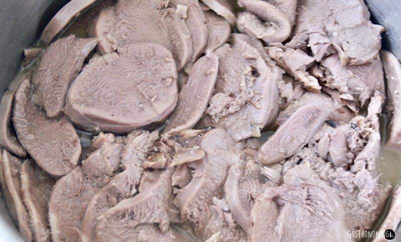 8. Ponemos la lengua sobre una tabla amplia y la pelamos, haciendo un pequeño corte sobre la membrana que la recubre y retiramos dicha membrana con las manos, a estas alturas debe de ser muy fácil de retirarla. Ahora cortamos la lengua del grosor que queramos, bien podrías hacerlo en escalopines gruesos, en finas tajadas o incluso picarla según el uso que vayas a darle. Reservamos.