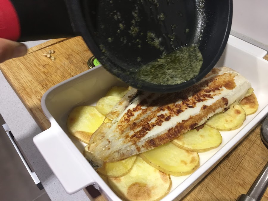 4. Emplatamos el lenguado sobre la cama de patatas horneadas y vertemos la meuniere por encima de éste. Si fuese necesario podemos poner un poquito más de perejil Orballo por encima.