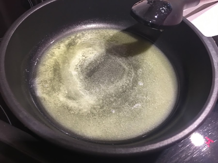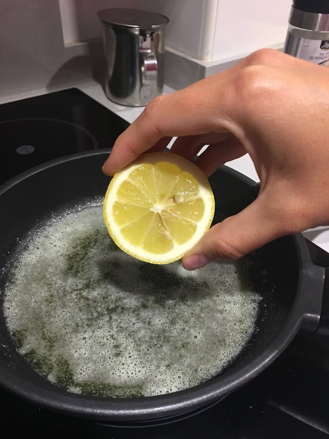 3. Mientras se va marcado el pescado, preparamos la meuniere. Ponemos los 100g de mantequilla a fuego medio, dejamos que se deshaga y que coja un colorcito algo más tostado, no demasiado. Añadimos el zumo de limón y dejamos 1 minuto al fuego. Finalmente incorporamos el perejil de Orballo.