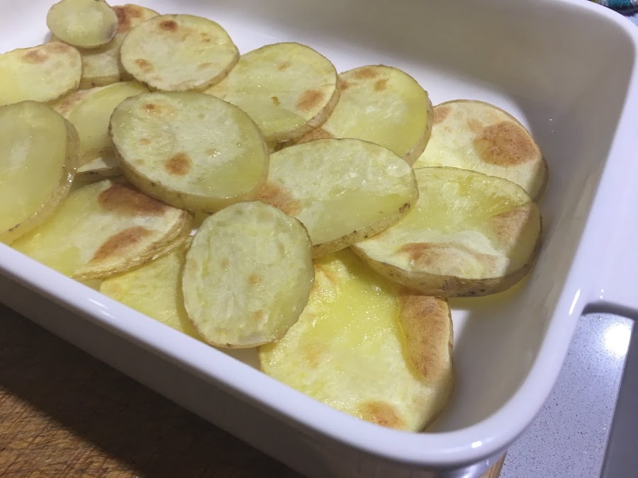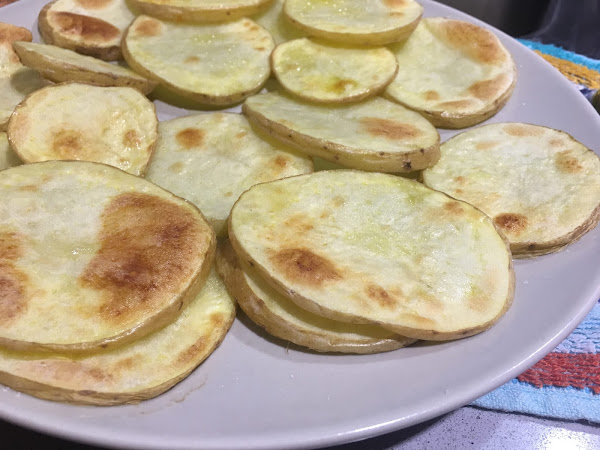 1. Empezamos lavando y laminando las patatas. Las horneamos durante 20 minutos a 200ºC hasta que tomen un color tostado. Retiramos y colocamos en la bandeja donde vamos a emplatar el lenguado.