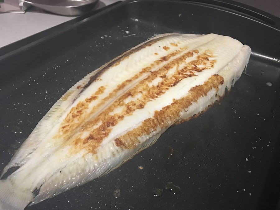 2. Lavamos el lenguado, secamos y salamos. Ponemos la plancha a calentar con un pelín de aceite de oliva virgen extra. A fuego medio alto lo hacemos por las dos caras. El pescado conviene no marearlo así que asegurate que está antes de darle la vuelta, si le damos muchas vueltas podría romperse.