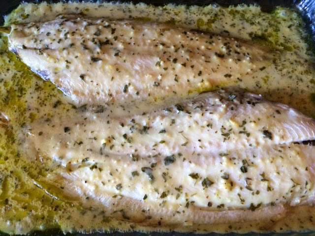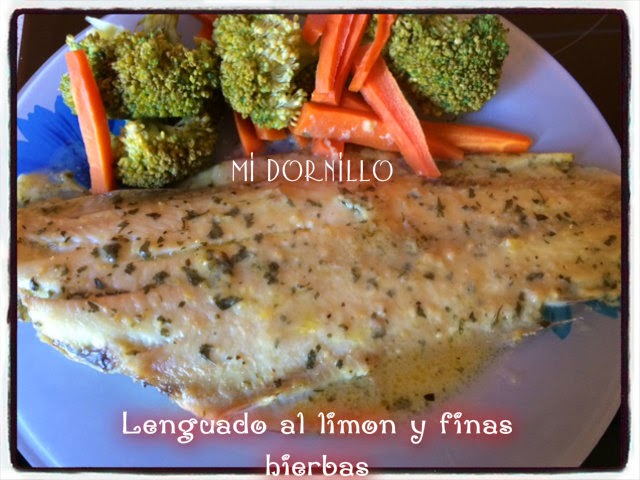 Después le añadimos las hierbas provenzales y las ralladuras de limón y el perejil muy picadito. Volcamos la salsa por encima de los lenguados y removemos la bandeja para que la salsa se ligue con los jugos que ha soltado el pescado.