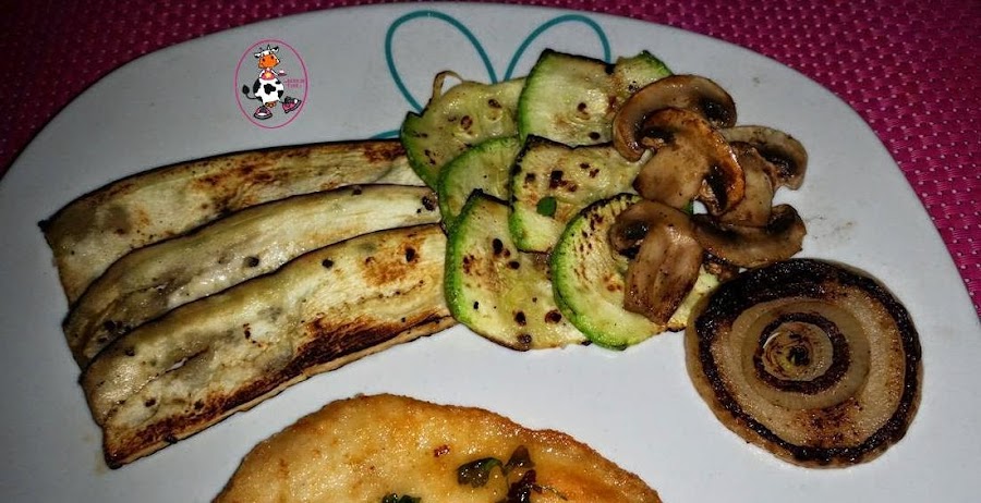 Lavamos y cortamos en rodajas las verduras, el calabacín,la berenjena,la cebolla y los champiñones. Ponemos una gotita de aceite en la plancha y ponemos las verduras con un poquito de sal.