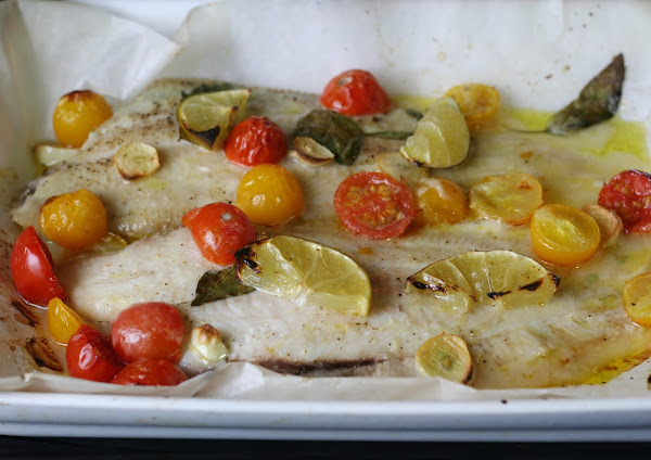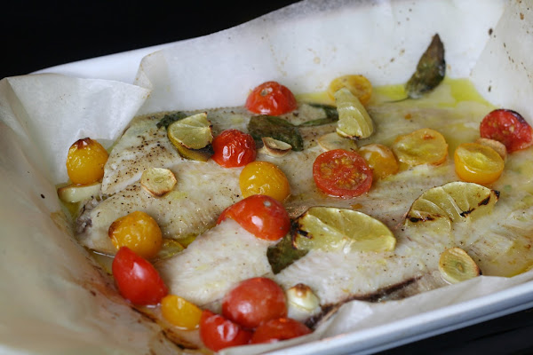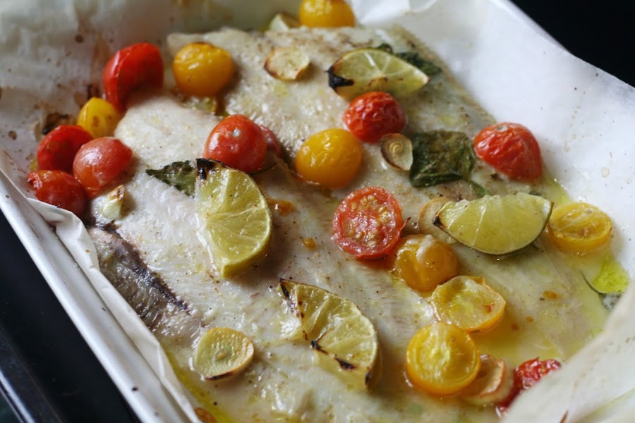 La preparación de este plato no puede ser más rápida y más sencilla. Salamos los lenguados que el pescadero nos habrá limpiado previamente. Cubrimos una fuente de horno con papel vegetal y rociamos con aceite de oliva. Ponemos encima los filetes de lenguado. Añadimos pimienta blanca y pimienta negra, los tomates cherry lavados y cortados por la mitad, unas hojas de albahaca fresca entera, dos rodajitas de lima cortadas por la mitad y un diente de ajo en láminas. Repartimos bien por encima del pescado, añadimos un poquito más de sal y regamos con aceite de oliva y unas gotitas de zumo de lima. Metemos al hrno precalentado a 220º durante 20-25 minutos. Servimos el pescado acompañado de los jugos que habrá soltado durante la cocción en el horno.