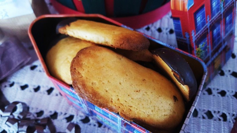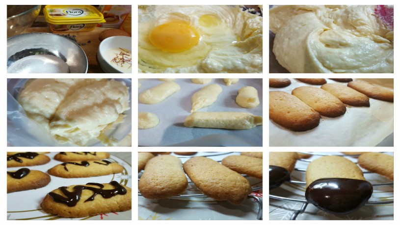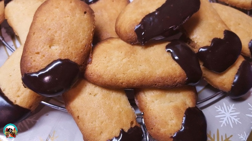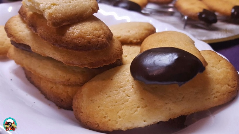 3.- Introducimos la masa en una manga pastelera, cubrimos una placa con papel de horno. Dispersamos la masa en forma de lenguas, separadas entre si. Las horneamos 15 minutos y las dejamos enfriar. Fundimos el chocolate al baño María, bañamos las lenguas de gatos en chocolate y las dejamos enfriar.